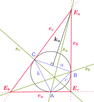 Hierbei bezeichnen die Fläche des Dreiecks und die senkrechten Verbindungsstrecken zwischen den Dreiecksseiten und den Exsymmedian-Punkten .