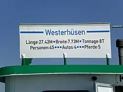 Das derzeit (Stand 2010) eingesetzte Fährboot hat eine Länge von 27,42 m und eine Breite von 7,73 m. Die Tonnage beträgt 8 t. Die Fähre ist für 45 Personen oder 4 Autos oder 5 Pferde zugelassen.
