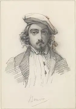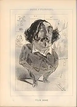Félix Bovie, Karikatur von Félicien Rops, Lithographie aus der Zeitschrift Uylenspiegel, 1856, British Museum