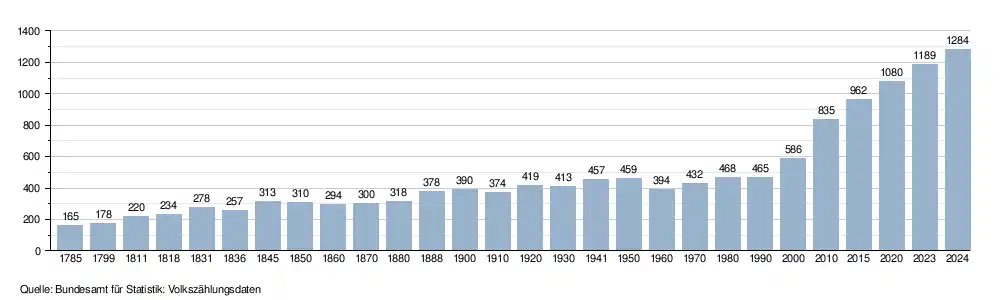 - ↑ Daten der Eidgenössischen Volkszählungen ab 1850 nach Gemeinden. (XLSX; 10 MB) Bundesamt für Statistik, Neuchâtel, 12. Juli 2024, abgerufen am 29. August 2025 (Öffnung in Excel nur über "Anhang/Excel-Datensatz" möglich).