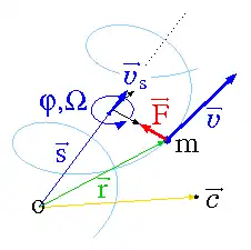 Betrachtet wird eine Punktmasse mit der Masse m, die sich mit der konstanten Winkelgeschwindigkeit auf einer Schraubenlinie mit Radius R um einen Punkt bewegt, der sich mit konstanter Translationsgeschwindigkeit verschiebt, siehe Bild. Das Bezugssystem K’ wird in den Punkt gelegt mit der festen Position des Massenpunktes in K’. Dann lautet die Bewegungsfunktion: