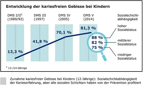 81 Prozent der 12-jährigen Kinder sind heute kariesfrei. Die Zahl der kariesfreien Gebisse hat sich in den Jahren von 1997 bis 2014 verdoppelt. Bei den 35- bis 44-Jährigen ist die Anzahl der Zähne mit Karieserfahrung seit 1997 um 30 Prozent zurückgegangen. Die Anzahl der Zähne mit Wurzelkaries hat sich in diesem Zeitraum halbiert. Die schweren Parodontalerkrankungen haben sich halbiert.