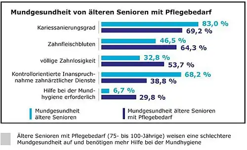 Ältere Menschen mit Pflegebedarf haben eine höhere Karieserfahrung, weniger eigene Zähne und häufiger herausnehmbaren Zahnersatz als die gesamte Altersgruppe der älteren Senioren (75- bis 100-Jährige). Knapp 30 Prozent der Menschen mit Pflegebedarf sind nicht mehr selbst in der Lage, ihre Zähne und Zahnprothesen eigenständig zu reinigen und zu pflegen. 60 Prozent der Menschen mit Pflegebedarf sind nicht mehr in der Lage, einen Zahnarzttermin zu organisieren und eine Zahnarztpraxis alleine aufzusuchen.