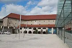 Der Westtrakt ist ein Bau mit leicht gekrümmtem Verlauf und einer unregelmäßigen Geschoß- und Achsverteilung. Die monumentale Hauptfassade weist frühbarocke Formen auf. Die Durchfahrt, eine hohe vierjochige Halle, wurde im 17. Jahrhundert als Verbindung der beiden ursprünglich getrennten Flügel geschaffen. In der Durchfahrt ist die römerzeitliche Grabinschrift für die Einheimischen Subito, seine Gattin Vercilla und seinen Sohn Castio sowie eine Bauinschrift für die Wiederherstellung eines den Termunes geweihten Heiligtums. Der Westtrakt wird im Obergeschoß vom Treppenhaus aus über einen hofseitigen, sechsjochigen Arkadengang erschlossen. An der Südostecke der Hoffront befindet sich eine zweigeschoßige, einjochige Loggia aus dem 16. Jahrhundert.