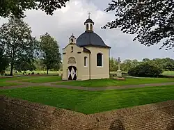 Die Gruftkapelle ist von den Rasenflächen eines Friedhofs umgeben, auf dem Grabsteine liegen und Kruzifixe stehen. Dieser Friedhof, der über einen im Sechseck verlaufenden Weg erschlossen wird, ist von einer niedrigen polygonal geführten Mauer aus Backstein eingefriedet, die ihrerseits von einem Trockengraben umgeben ist. In die Mauer sind zwei Tore aus Schmiedeeisen eingelassen, vor denen kleine Brücken aus Backstein den Trockengraben überspannen. Die Tore rahmen Backsteinpfeiler mit barocken Wappenaufsätzen.