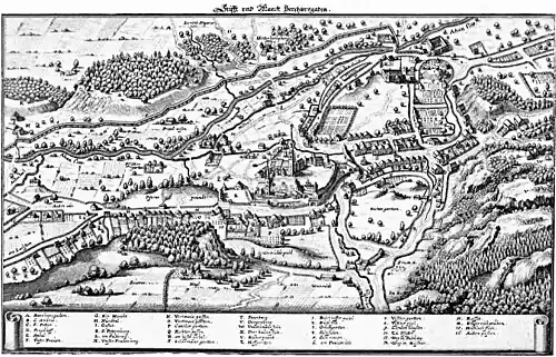 Der erste Teil des Namens könnte sich entweder von der Perchta oder einem Siedler mit dem Namen Perther ableiten, der zweite Teil von Gaden, einem umzäunten Wohnsitz. Nach Helm und Feulner könnte dieser Perther auch ein Aribone gewesen sein, der dort ein einstöckiges Haus beziehungsweise eine Jagdhütte unterhielt, in deren Nähe auch einige Hütten für Dienstleute standen.[16][17][18][19] Ab Ende des 12. Jahrhunderts ist in den Urkunden häufig von „berhtersgaden“ die Rede.[20] Eine andere Quelle nennt die Schreibweisen „Berchtersgadmen“ für 1106 (im Gegensatz zur fehlerhaften Schreibweise „Berthercatmen“ einer päpstlichen Kanzlei), für 1121 „Perehtgeresgadem“; weitere Schreibweisen im 12. Jahrhundert seien „Perhtersgadem“, „Perthersgadem“ und „Berhtersgadem“ gewesen.[21] In der 1456 gefertigten Kopie einer Urkunde von 1266 ist zum ersten Mal die heutige Schreibweise „Berchtesgaden“ enthalten.[21] Spätestens ab dem 18. Jahrhundert ist (auch) von Brechtolsgaden[22] die Rede, in Historische abhandlungen der königlich-baierischen Akademie aus dem Jahr 1807 vom „vormaligen Stift Bertholdsgaden“. Und in Herders Conversations-Lexikon von 1854 gibt es, korrespondierend mit einer Berchtesgadener Sage, die alternierenden Stichwörter „Berchtesgaden“ und „Berchtoldsgaden“.[23][24]