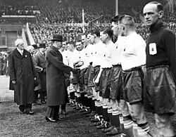 Georg V. bei der Begrüßung der Spieler von Huddersfield Town.