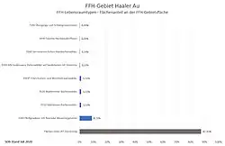 Das FFH-Gebiet besteht zu 90 % aus feuchtem und mesophilem Grünland und zu 8 % aus Binnengewässern, siehe Diagramm 1. Am Beginn des FFH-Gebietes bei Kaaksburg ist der Quellfluss der Haaler Au von Laubwald umgeben.[7]