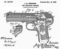 Die Schließfeder befindet sich über dem Lauf, dadurch liegt der Lauf tief, nahe beim Schwerpunkt der Waffe. Damit verfügt sie über Zweitschuss-, beziehungsweise Deutschuss-Eigenschaften, auch wenn der „Single Action“-Abzug recht hart ist. Um möglichst wenig Teile zu verwenden, bewirkt die Schließfeder sowohl das Rückführen des Verschlusses als auch das Vorschnellen des Schlagbolzens. Die Waffe ist hahnlos und hat ein Schlagbolzenschloss. Somit kann sie nur mittels Durchladen gespannt werden, indem der Schlagbolzen in seiner hinteren Position von einer Klinke gefangen und gehalten wird. Das Betätigen des Abzuges bewirkt ein Abschwenken der Fangklinke und eine Freigabe des Schlagbolzens, welcher dann unter Federdruck nach vorn auf das Zündhütchen schnellt. Solange die Waffe ungespannt ist, schiebt sich ein Metallstück gut sichtbar in den Spalt der Kimme und verdeckt das Korn. Browning beschreibt die Waffe in der Patentschrift als GAS OPERATED FIREARM.