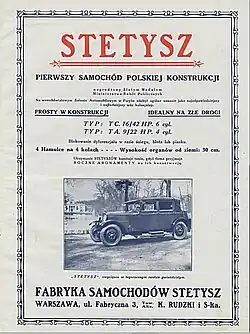 Der Pole Stefan Tyszkiewicz lebte in Frankreich. Er entwickelte ab 1923 einen Prototyp, der 1926 serienreif war. Dazu gründete er in Warschau das Unternehmen Fabryka Samochodów Stetysz, das in Verbindung zu Towarna Akc. Konstrukcij Mostowych Rudski stand, und begann mit der Produktion von Automobilen. Der Markenname lautete Stetysz oder Ralf-Stetysz = Rolniczo Automobilowo-Lotnicza Fabryka Stefana Tyszkiewicza. 1928 endete die Produktion, nachdem ein Feuer im Werk großen Schaden angerichtet hatte.[1]