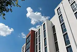 Das Ersatzgebäude aus Stahlbeton interpretiert die Stilelemente der historistischen Architektur durch sandsteinfarbene Faserzementplatten als horizontale Bänder im Erdgeschoss. Planung und Ausführung übernahm die Deutsche Rentenversicherung Rheinland-Pfalz in Eigenregie.
