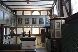 Das Kirchengebäude ist ein zweistöckiges rechteckiges Fachwerkgebäude. Der Innenraum war vor dem Abriss verputzt und wurde nach dem Wiederaufbau im ursprünglichen Zustand mit sichtbarem Fachwerk wiederhergestellt. Im Innenraum sind an der Westempore die vier Evangelisten und an der Längsempore die zwölf Apostel dargestellt. Ein Sandsteinaltar und eine Kanzel mit marmorierter Mittelsäule bilden neben dem Gestühl die Inneneinrichtung.