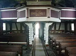 - Von der barocken Innenausstattung sind der reich verzierte Altar vom Anfang des 18. Jahrhunderts, die Patronatsloge, der Taufstein und die Orgelempore, die auf vier gewundenen Stützen steht.