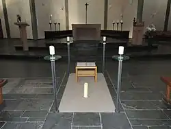 - ↑ Die Begräbniskirche. Unsere Kirche wird im Lauf des Jahres 2025 zu ersten Urnenbegräbniskirche Hessens umgestaltet. Sie bietet Platz für 2500 Urnen in ästhetischer, würdevoller Umgebung der denkmalgeschützten Kirche von Rudolf Schwarz. In: Webseite des Fachzentrums Trauerseelsorge. Bistum Limburg Bischöfliches Ordinariat, 2024, abgerufen am 16. April 2025 (deutsch).