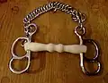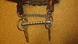Links Liverpool-Kandare, rechts Ellbogenkandare, beide Leinen im ersten Schlitz verschnallt -