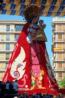 Zum offiziellen Programm gehört z. B. die Ofrena de Flors, der zweitägige "Opfergang" zu Ehren der Heiligen Jungfrau der Hilflosen, die gleichzeitig die Stadtpatronin Valencias ist. An der Ofrena de Flors nehmen über 100.000 Männer, Frauen und Kinder in bunten Trachten teil. Die Herren kommen im traditionellen Anzug, die Damen in Röcken aus feiner Seide und teuerem Brokat, die Haare kunstvoll aufgesteckt. In den Gala-Kostümen steckt nicht selten ein ganzes Monatseinkommen; sie werden aber immer wieder getragen. Auf der Plaza de la Virgen wird eine 14 Meter hohe Holzstatue der Heiligen Jungfrau aufgebaut. Darauf wird aus den Blumen, die die Teilnehmer der Ofrenda bringen, das Madonnenkleid gesteckt. Fast 50 Tonnen Rosen und Nelken, Gladiolen und Tulpen, Anemonen und Lilien – Blumen, die aus ganz Spanien nach Valencia eingeflogen werden – werden benötigt.