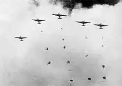 Am 19. Februar 1942 landeten in einer ersten Angriffswelle 300 Fallschirmjäger der 3. Yokosuka SLKM bei Kupang auf Niederländisch-Indien Westtimor. Wie üblich sollten sie von der eigentlichen amphibischen Landung einer kombinierten Heeres-Marine-Streitmacht von 4600 Mann ablenken.[10] In einer zweiten Absetzwelle wurden weitere 500 Fallschirmjäger abgesetzt. In erbitterten Kämpfen wurden über 700 Fallschirmjäger getötet und lediglich 78 Mann überlebten.
