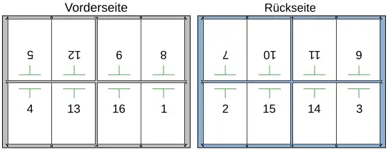 Das obige Beispiel zeigt die Seitenverteilung beim häufigst angewendeten Kreuzbruchfalz für einen 16-seitigen Druckbogen. Acht Seiten kommen auf die Vorder- und acht Seiten auf die Rückseite. Nach dem Druck wird das Papier zuerst vertikal gefalzt (Seite zwei fällt auf Seite drei), dann horizontal (Seite vier fällt auf Seite fünf) und schließlich nochmals vertikal (Seite neun fällt auf Seite acht). Der von der Falzmaschine erzeugte Bruch am Kopf und Rücken der Druckbogen dient bei einer nötigen Weiterverarbeitung auch als neue Anlage. Die Satzspiegel der fertig gefalzten Bogen liegen jetzt exakt übereinander. Zusätzliche außerhalb des Satzbildes angebrachte Schneidzeichen und Falzmarken erleichtern die Arbeit des Maschinenführers beim Falzen, diese Zeichen werden nach dem späteren Endbeschnitt nicht mehr sichtbar sein.