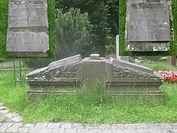 08 | P | K | Adolf Müller-Palm, Journalist, Schriftsteller und Zeitungsverleger. | 1840 | 1904 | NN, Doppelpult mit Kreuz (verloren) und zwei Liegeplatten, Liegeplatte von Adolf Müller-Palm als aufgeschlagenes Buch (rechts). |