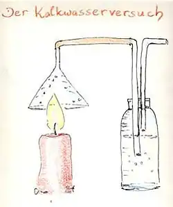 Leitet man den Luftstrom über der Flamme in Kalkwasser, so erfährt dieses sogleich eine milchige Trübung. Die gleiche Trübung tritt ein, wenn wir unsere Atemluft hereinblasen, jedoch durch Raumluft nicht merklich. Die Flamme „atmet“ also ähnlich wie wir Menschen. Ein Versuch mit reinem Kohlendioxid ergibt eine analoge Trübung. Den Begriff hat wohl jeder Schüler schon einmal gehört; nunmehr füllt er sich etwas mit Inhalt.
