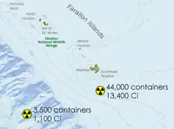 Die Umgebung der Farallon-Inseln ist auch als Farallon Island Nuclear Waste Dump bekannt, da zwischen 1946 und 1970 radioaktive Abfälle durch die US Atomic Energy Commission im Meer entsorgt wurden. Nach einem 1980 von der United States Environmental Protection Agency (USEPA) veröffentlichten Bericht wurden zwischen dieser Zeit, aber hauptsächlich vor 1960, ca. 47.500 Container und Stahlfässer mit kontaminierten Abfällen bei dieser Inselgruppe versenkt, welche die Fischerei und das Schutzgebiet mit ca. 40,7 Terabecquerel (TBq) (angegeben in der veralteten Einheit 14.500 Ci) belasten. Die Hauptlagerstätte befindet sich bei den Koordinaten 37° 37′ N, 123° 17′ W in 1700 m Tiefe, während ca. 3500 Behälter bei 37° 38′ N, 123° 08′ W versenkt wurden und heute in einer Tiefe von 900 m liegen.[6] Das in San Francisco beheimatete Naval Radiological Defense Laboratory gilt als Hauptnutzer dieser maritimen Müllhalde, da es mit der Dekontamination von Atombombentestobjekten beauftragt wurde.[7] So wurde unter anderem der Flugzeugträger Independence (CVL-22), der während der ersten beiden Atombombentests im Rahmen von Operation Crossroads als Testschiff diente, mit radioaktiv kontaminierten Materialien verschiedener Abnehmern – u. a. des NRDL – beladen, und Ende Januar 1951 als Zielschiff durch die US-Marine versenkt.[8] Nach Angaben des United States Geological Survey sind der Grad der Gefährdungen durch den nuklearen Abfall an die Umwelt und die exakte Lage der einzelnen großen Container unbekannt.[9] Eine Bergung der Abfälle vom Meeresgrund, um sie dann in speziellen Endlagerstätten zu deponieren, sollte auf Anraten der USEPA nicht durchgeführt werden, da zu viele Risiken für die Menschen und das nähere Umfeld bestünden.[10]
