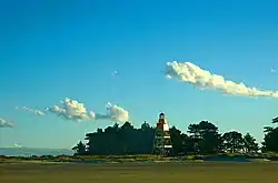 1869 wurde am damaligen Ende der Nehrung mit dem Bau eines Leuchtturms begonnen, da viele Schiffe am Farewell Spit Schiffbruch erlitten hatten. Der erste Leuchtturm, eine Holzkonstruktion, wurde am 17. Juni 1870 in Betrieb genommen. Die Holzkonstruktion eignete sich jedoch nicht für den Standort mit den häufigen Sandstürmen. Im Januar 1891 wurde ein zweiter Leuchtturm eingeweiht, diesmal eine Fachwerkkonstruktion aus Stahl. Dieser Turm ist 27 Meter hoch, die Feuerhöhe beträgt 30 Meter. Das weiße Licht ist 19 Seemeilen (35 Kilometer) weit sichtbar, das rote 15 Seemeilen (27 Kilometer).