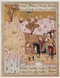 “Taken together, the poetry, the miniatures, and the data from examination of the site suggest that Farhād was the architect of the Sasanian works at Bīsotūn. The chiseled rock face must be the wall of his “passage through the mountain for twenty horsemen.” The milk channel, which is also often depicted in miniatures, is likely to have been the working channel on top of the cliff—an opinion in which G. Cameron concurred (oral communication). The notion of the “portrait of Šīrīn” may well have been evoked by the capitals showing Anāhīd and Ḵosrow Parvēz, which were certainly visible in the time of Neẓāmī and his informants, as they have never been buried under earth. The first writer to connect them with Šīrīn was ʿAbd-al-Karīm, in 1145/1741, probably relying on local tradition. References to the Sasanian remains in the literature of the early Islamic period apparently stirred people's imaginations and inspired poetic compositions in later times. Although Neẓāmī never left his hometown, Ganja, and thus never saw Bīsotūn, he had access to information recorded by geographers in the 4th/10th century and passed on as part of the literary tradition.”