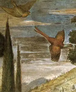 In der Symbolik der bildenden Kunst späterer Jahrhunderte ersetzt der Fasan oft den Pfau und steht dann entsprechend als Symbol der Auferstehung (Phönix), für die Göttin Hera, als Symbol der Liebe, der Wollust oder des Hochmuts. Besonders Fasanenpasteten wurden als Allegorie der Superbia und der Gula abgebildet – ab dem 15. Jahrhundert wurde der gebratene Fasan oft im vollen Gefieder serviert. Einzige eigenständige Bedeutung in der Ikonografie hat der vom Habicht verfolgte Fasan als Sinnbild der verfolgten Seele.[47] Später ist der Fasan ein beliebtes Motiv in Jagdstillleben und Landschaftsgemälden. Eine besondere Rolle kam dem Fasan beim Fasanenfest 1454 am burgundischen Hof zu.