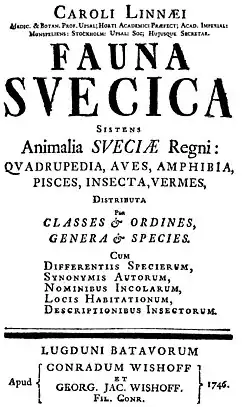 Die erste Auflage erschien 1746 unter dem vollständigen Titel Fauna Suecica sistens Animalia Sveciae Regni: Quadrupedia, Aves, Amphibia, Pisces, Insecta, Vermes, distributa per Classes & Ordines, Genera & Species. Cum differentiis Specierum, synonymis Autorum, nominibus Incolarum, locis Habitationum, descriptionibus Insectorum beim Stockholmer Verleger Lars Salvius (1706–1773).