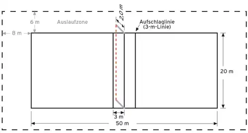 Das Spielfeld wird durch ein 5 cm breites netzartiges rot-weißes Band halbiert. In der Vergangenheit wurde hierfür eine Leine verwendet, die jedoch der besseren Sichtbarkeit wegen in den letzten Jahren weitgehend durch das Band abgelöst wurde. Es ist an der Mittellinie zwischen zwei Pfosten gespannt, seine Oberkante befindet sich in 2 m Höhe (Männer) bzw. 1,90 m (Frauen). Für die D-Jugend (bis 12 Jahre) beträgt die Höhe 1,60 m, bei der C-Jugend (bis 14 Jahre) 1,80 m. Zum Spielfeld gehört auch eine Auslaufzone, die im Freien eingezeichnet ist (8 m nach hinten, 6 m an den Seiten), in der Halle jedoch durch die Wand oder Tribünen begrenzt wird (Minimum: 1 m nach hinten und 0,5 m an den Seiten).
