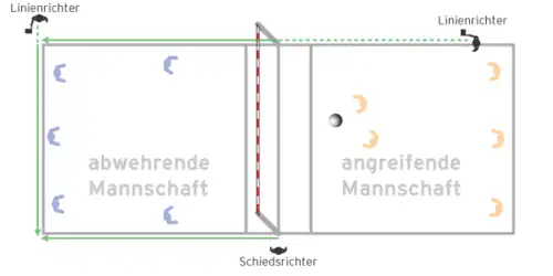 - Der Ball wird seitlich an den Pfosten vorbei oder unterhalb des Bandes ins gegnerische Feld gespielt. Er darf nur oberhalb des Bandes und zwischen den gedanklich nach oben verlängerten Pfosten ins gegnerische Halbfeld gespielt werden.