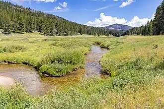 ![]() Oberlauf des Fawn Creek mit dem Sepulcher Mountain im Hintergrund | ||