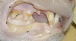 Bei einigen infizierten Katzen kann es zu einer chronischen ulzerativ-proliferativen Gingivostomatitis kommen. Histologisch lassen sich in der Schleimhaut eingewanderte Plasmazellen und Lymphozyten nachweisen, begleitet von einer unterschiedlich stark ausgeprägten neutrophilen und eosinophilen Entzündung. Die Läsionen sind sehr schmerzhaft, weshalb die betroffenen Tiere oft die Nahrungsaufnahme verweigern und stark abmagern. Häufig kommt es auch zum Ausfall von Zähnen.[14]