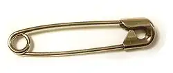 Eine Sicherheitsnadel wird durch die vorgespannte Schenkelfeder geschlossen gehalten.