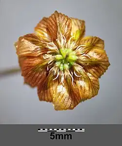 Die Früchte sind einsamige kleine Nüsse, die von der bleibenden, bräunlichen, pergamentartigen Blütenkrone umgeben sind. Diese Blütenkrone wirkt durch Lufteinschluss als Flugorgan. Die Diasporen werden als Ballonflieger und Regenschwemmlinge ausgebreitet. Auch Zufallsverbreitung durch Huftiere ist möglich. Fruchtreife erfolgt ab Juli bis August.