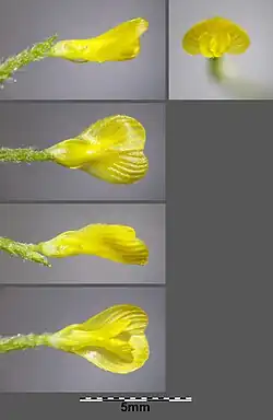 Die zwittrigen Blüten sind zygomorph und fünfzählig mit doppelter Blütenhülle. Die fünf 1 bis 3 Millimeter langen Kelchblätter sind verwachsen. Von den fünf Kronblättern sind einzelne miteinander verwachsen. Die 4 bis 6 Millimeter lange Krone besitzt die typische Form einer Schmetterlingsblüte, ist anfangs gelb und wird beim Verblühen gelbbraun. Das Schiffchen besitzt einen spitzen Schnabel. Die Fahne ist grätennervig und muschelartig gebogen, jedoch nicht gefaltet.
