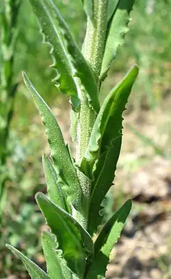 Die Laubblätter sind grundständig und wechselständig am Stängel verteilt angeordnet. Die Grundblätter sind 0,5 bis meist 1,5 bis 6 Zentimeter lang gestielt.[3][6] Die Blattspreite der Grundblätter sind bei einer Länge von 2 bis 6 (1 bis 8) Zentimetern sowie einer Breite von 0,5 bis 1,5 Zentimetern verkehrt-lanzettlich oder länglich mit sich verschmälernder Spreitenbasis und stumpfem oder fast spitzem oberen Ende; ihr Blattrand ist glatt, unregelmäßig fiederteilig oder leierförmig.[3][6] Die Stängelblätter sind sitzend. Die Blattspreite der Stängelblätter ist bei einer Länge von 1 bis 4 (0,7 bis 6,5) Zentimetern sowie einer Breite von 5 bis 10 (2 bis 15) Millimetern länglich, lanzettlich oder schmal-dreieckig-lanzettlich mit pfeilförmiger bis geöhrter Spreitenbasis und spitzem oder fast stumpfem oberen Ende; ihr Blattrand ist gezähnt oder fast glatt.[6][1] Die mittleren und oberen Stängelblätter sind mit ihrem pfeilförmigen Spreitengrund stängelumfassend.[1][2]