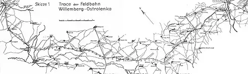 ![]() „Trace der Feldbahn Willemberg–Ostrolenka.“ Die Skizze von 1915 ist nach Nord-Osten ausgerichtet | |||||||||||||||||||||||||||||||||||||||||||||||||||||||||||||||||||||||||||||||||||||||||||||