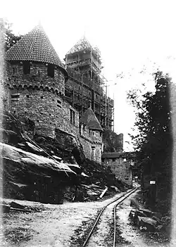 Die von Kaiser Wilhelm II. in Auftrag gegebene Restauration der Hohkönigsburg dauerte von 1900 bis 1908. Bis zu 220 Bauarbeiter und gewaltige Mittel wurden dafür eingesetzt. So wurde eine Dampflokomotive angeschafft, die auf einem auf Holzschwellen verlegten Gleis mit einer Spurweite von 600 mm zwischen dem Ostteil und dem Westteil der Baustelle verkehrte. Sie diente dazu, die Steinblöcke aus dem nahegelegenen Steinbruch zu befördern.[2] Nach acht Jahren Bauzeit wurde am 13. Mai 1908 die renovierte Hohkönigsburg eingeweiht.
