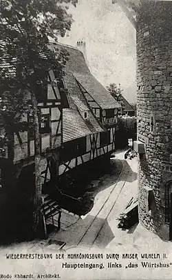 ![]() Vorderansicht, vor dem Eingange“ „Hohkönigsburg bei Schlettstadt, während der Wiederherstellung. Vorderansicht, vor dem Eingange“ | |