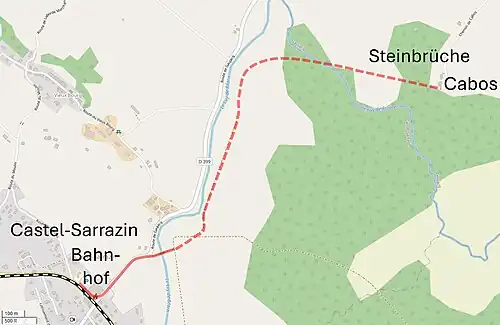 Die Feldbahnstrecke verband die Steinbrüche bei Cabos südöstlich des Schlosses Gaujacq mit dem Bahnhof von Castel-Sarrazin, wo der im Arbeitslager gewonnene Schotter in die Meterspurwagen auf der Bahnstrecke Dax–Amou der Compagnie des Tramways à Vapeur de la Chalosse et du Béarn (TVCB) umgeladen wurde. Der Bau der in Dax für den Umschlag verwendete Meterspur-Strecke war erst kurz vor dem Ersten Weltkrieg, am 3. Juni 1914, genehmigt worden. Sie wurde während des Kriegs von deutschen Gefangenen gebaut.