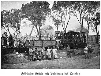 - ↑ a b c d B. Shang: 中国早期窄轨铁路(六)——八国联军在中国北部修筑的军用铁路 (Frühe chinesische Schmalspurbahnen VI - Von den alliierten Streitkräften der vereinigten acht Staaten in Nordchina gebaute Militäreisenbahnen).