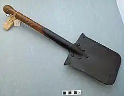 Mit der Verfügung vom 26. Januar 1938 (HV 38C, Nr. 82) wurde aus Einsparungsgründen die Verwendung von Kunstleder für die Spatentaschen angeordnet. Für die Trageschlaufen und den Befestigungsriemen war weiterhin Leder vorgesehen. Die Verfügung vom 12. November 1938 (HV 38C, Nr. 1038) gab die Einführung eines zusammenklappbaren Schanzzeugs, des Klappspatens, bekannt.[8] Dieser sollte in der Folgezeit den bisherigen Feldspaten ersetzen. Ziel war es, einen komfortableren Feldspaten einsetzen zu können, da der Klappspaten unter anderem mit einem längeren Holzstiel ausgestattet werden konnte, ohne die Verstaulänge zu erhöhen. Der Klappspaten, der ein spitzes Blatt besaß, hatte ausgeklappt eine Länge von rund 70, eingeklappt 50 cm.[9] Dieses Blatt konnte mittels einer aus Bakelit gefertigten Überwurfmutter in drei Stellungen fixieren werden.[8] Neben der senkrechten Haltung war nun eine Positionierung in Stielrichtung und im 90-Grad-Winkel zum aus Holz gefertigten Stiel möglich. Dadurch konnte der Spaten auch als Hacke eingesetzt werden. Der deutsche Klappspaten wurde gattungsprägend und gilt als Urvater dieses Spatenmodells. Die Funktionsweise wurde weltweit kopiert. Neben dem Klappspaten blieb in Deutschland jedoch das ältere, „stehende“ Modell während des Zweiten Weltkriegs wesentlich verbreiteter. Der Vorteil gegenüber dem Klappspaten war dessen einfachere, schnellere und damit auch günstigere Herstellungsweise, was insbesondere während des weiteren Kriegsverlaufs der Verknappung vieler Güter entgegentrat. Das schwarz lackierte Metall des eigentlichen Spatenblatts wurde sowohl beim älteren Modell, als auch beim Klappspaten in ein Leder- beziehungsweise Kunstlederfutteral geschoben. Beim Klappspaten war die Tragetasche unten spitz und oben eckig ausgeführt und bestand aus schwarzem oder feldgrauem Leder beziehungsweise Kunstleder. Während des Krieges bestand die Hülle der meisten Klappspaten aus olivfarbenem Segeltuch mit Schlaufen aus Webgurten. Im Gegensatz zum bisherigen Feldspaten wurde das Spatenblatt des Klappmodells von oben in das Futteral geschoben. Von Außen wurde die Konstruktion von einem Querriemen gehalten, Die obere Öffnung sicherte ein aufgeknöpfter senkrechter Riemen. Eine breite Trageschlaufe war an der dem Körper zugewandten Seite aufgenäht oder aufgenietet.[9] Diese Schutzhülle wurde aus Einsparungsgründen im Laufe des Krieges durch geschwärzte Exemplare aus Pressstoff, einem Ersatzmaterial aus speziell geschichtetem und behandeltem Papierzellstoff, ersetzt. Die als Rahmen gefertigten Spatenhüllen besaßen ursprünglich an der Vorder- und Rückseite in der Mitte eine rechteckige Aussparung durch die der Spaten selbst sichtbar wurde. Mittels der Trageschlaufen an den Futteralen wurden beide Spatenmodell auf das Koppel aufgeschoben und hinter der linken Hüfte getragen. Dabei konnten die Hüllen je nach Hersteller eine oder zwei Befestigungsschlaufen besitzen. Bei Ausführungen mit zwei Schlaufen wurde die Tasche für das Seitengewehr dazwischen mit aufgeschoben, bei Modellen mit einer Schlaufe kam die Seitengewehrtasche darüber. Der außen schräg aufgesetzte Schnallriemen der Spatentasche war extra lang ausgeführt, um gleichzeitig das Seitengewehr zu fixieren. Neben diesen bekanntesten Formen des damaligen Schanzzeugs sind auch weiterhin stehende Spaten mit spitzem Blatt in Verwendung gewesen. Weitere von der Norm abweichende Spaten und Taschen wurden während des Dritten Reichs teilweise auch von nichtmilitärischen Organisationen getragen und im Zuge der immer schwieriger werdenden Versorgungslage auch beim Militär eingesetzt. Daher fanden sich dort auch Spatentaschen, deren rückseitiger Rahmen durchgehend aus Leder besteht oder Taschen aus Segeltuch mit Webgurtschlaufen.[8]
