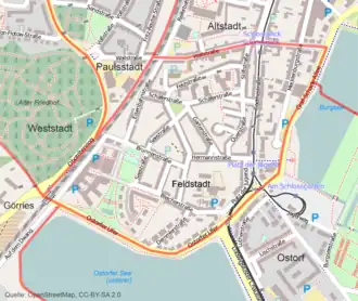 Haupterschließungsstraßen sind östlich die Goethestraße, der Platz der Jugend und die Graf-Schack-Allee am Burgsee, südlich das Ostorfer Ufer, westlich die Bleicherstraße und die Brunnenstraße sowie die Eisenbahnstraße und nördlich die Wallstraße sowie der Lobedanzgang.