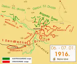 Die 62. Infanteriedivision unter FML Kalser von Maasfeld drang ab 27. November 1915 aus dem Raum Višegrad von Norden her in Montenegro ein und drängte die gegnerischen Abwehrkräfte auf eine Linie von Pljevlja (1. Dezember) und Bijelo Polje (16. Dezember) entlang des Flusses Tara zurück. Im Laufe des Dezember wurde dort angehalten um die Nachschublinien abzusichern. Parallel dazu drang etwas östlicher auch die 53. Infanterie-Truppendivision (FML Pongracz) von Nordosten nach Süden vor. Um das weitere Vorgehen der 62. und 53. Division am Tor von Mojkovac zwischen den Hochgebirgsstöcken des Durmitor-Sinjajevina-Plateaus und der Bjelašnica aufzuhalten, befehligte Serdar Janko Vukotić nach dem Vorstoß der k.u.k. Divisionen am 6. Januar, dem Heiligen Abend nach Julianischem Kalender, einen generellen Angriff seiner Armee von 6500 Mann zum 7. Januar gegen die gut ausgebaute Stellung der k.u.k. Armee auf der Bojna njiva. Daraus entwickelte sich die Schlacht von Mojkovac am Weihnachtsfest der orthodoxen Montenegriner, die ihren Höhepunkt im Zusammentreffen der beiden Hauptkräfte der Armeen in einen äußerst blutigen Kampf auf Bajonetten um die Bojna njiva erreichte. Nachdem die beiden ersten montenegrinischen Angriffe stecken geblieben waren, führte Serdar Vukotić unter der Weisung, dass das Feld unter allen Mitteln einzunehmen sei, seine einzige Reserve, das Drobnjačka-Bataillon, ins Gefecht. Nachdem die erste Reihe der 53. Division eingenommen worden war, nicht jedoch die zweite, folgte ein allgemeiner Angriff der drei Gruppen des Bataillons in einer Linie im Sturm auf die Verteidigungsstellungen. Der Kampf wurde, nachdem das Bataillon auch in die Hauptreihe der 53. Division eingedrungen war, in der Entscheidung mit Messern und Bajonetten geführt, woraufhin die k.u.k. Truppen die Bojna njiva fluchtartig verlassen mussten. Nachdem die Montenegriner so die Bojna njiva eingenommen hatten, entschied General Wilhelm von Reinöhl (1859–1918) einen Gegenangriff in der Absicht der Zurückeroberung mit Aufgebot der letzten Reserven und der 205. Brigade. Der Kampf auf der verschneiten Bojna njiva dauerte bis in die Nacht; keine Seite konnte eine Entscheidung herbeiführen.