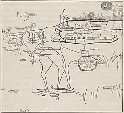 Ganz oben auf der Felswand befindet sich eine sechs Meter lange Abbildung eines Wals, bei dem es sich möglicherweise um einen Schnabelwal handelt.[5] Neben Hirschen und Walen gibt es fünf Vögel und einen Bären. Die Vogelfiguren sind zwischen 20 und 60 cm lang[5] und sind vom „Vogel-Wal-Typ“, d. h. sie sind so geformt, dass sie so gut als Wale wie auch als Vögel interpretiert werden können.[6]