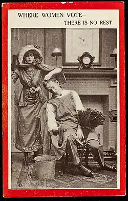 Die erste Welle des Feminismus ebbte in den 20er Jahren des 20. Jahrhunderts ab. Grundlegende Forderungen wie das Frauenwahlrecht waren in einigen Ländern erfüllt. Als Folge der Einführung des Frauenwahlrechts beschäftigten sich die weiblichen Abgeordneten nicht nur mit der weiteren Durchsetzung des Zugangs zu bisherigen Männerberufen, wie dem Richteramt, sondern auch mit der Sozialgesetzgebung und dem Umgang mit Prostitution und Asozialität.[55] In der Weltwirtschaftskrise ab 1929 verschärfte sich die Konkurrenz um Arbeitsplätze, Frauen wurden in der Regel als erste entlassen. Nun wirkten zahlreiche Faktoren zusammen, die den Frauen wieder ihren traditionellen Platz zuwiesen.