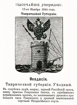 Offizielles Wappen des Russischen Reiches Feodosia. Wappen der Stadt des Russischen Reiches, Feodossija, Provinz Taurid (Taurien), 1844