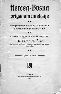 Ferdo plemeniti Šišić (eingedeutscht Ferdinand von Šišić; * 9. März 1869 in Vinkovci, Österreich-Ungarn, heute Kroatien; † 1. Januar 1940 in Zagreb, Königreich Jugoslawien) war ein jugoslawischer Historiker, der als Begründer der modernen Geschichtsschreibung Kroatiens gilt.[1] Er leistete insbesondere wesentliche Forschungsbeiträge zu Themen des Frühmittelalters in Kroatien und Bosnien, aber auch zu anderen Zeitepochen der südslawischen Geschichte.