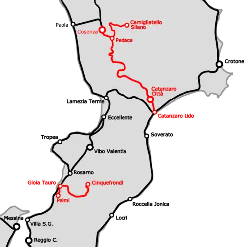 - Cosenza–Pedace–Catanzaro (mit Zahnstange zwischen Catanzaro Città und Catanzaro Lido)